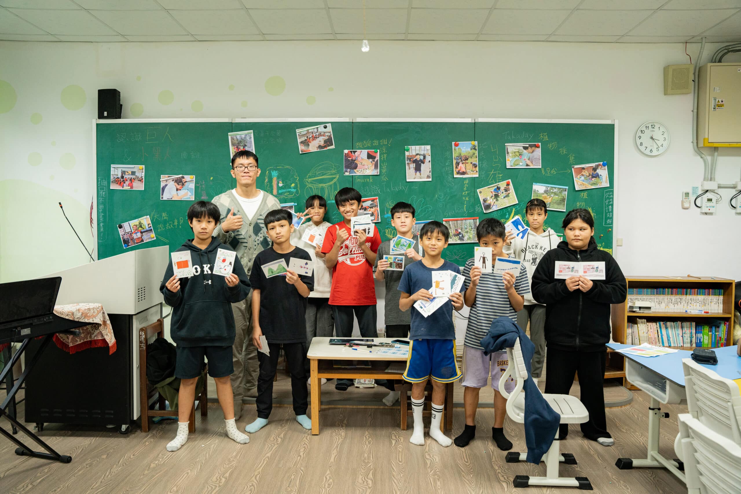 這裡既是日常教學的場域,也是一場正在進行的文化展覽。學生親自參與布置,在貼作品、擺位置的過程中,重新認識這些創作的展示價值,學習故事可以如何被呈現,也明白自己在支亞干文化裡,正扮演著重要的角色。